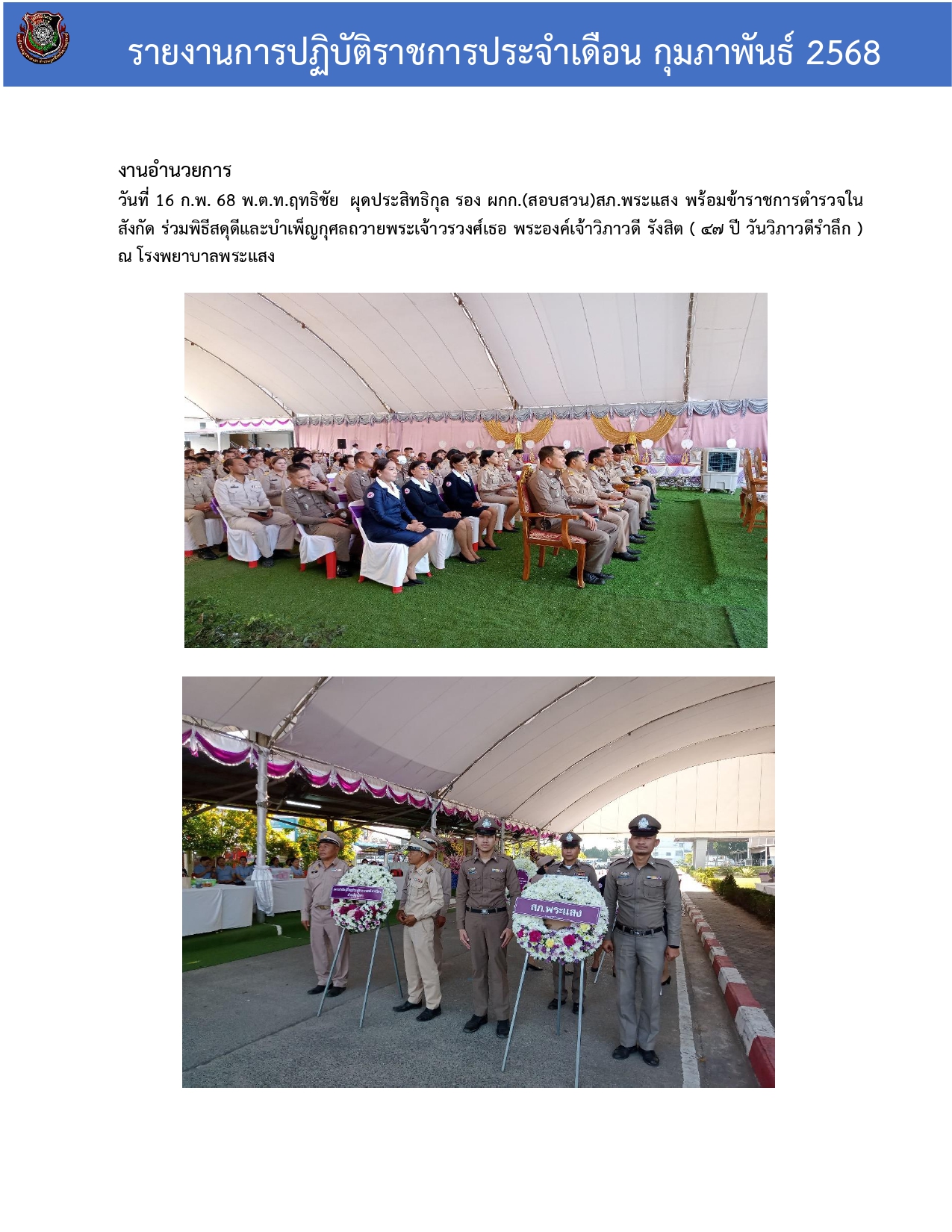 รายงานการปฏิบัติราชการประจําเดือนกุมภาพันธ์ 2568 ประจําปีงบประมาณ พ.ศ. 2568 สถานีตํารวจภูธรพระแสง วั