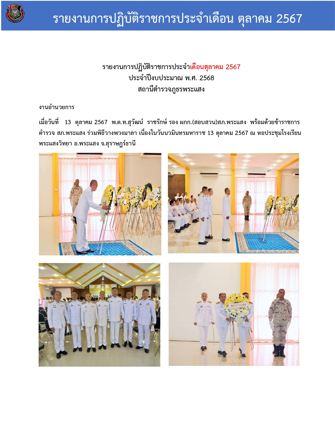 รายงานการปฏิบัติราชการประจําเดือนตุลาคม 2567 ประจําปีงบประมาณ พ.ศ. 2568 สถานีตํารวจภูธรพระแสง ชุดสาย