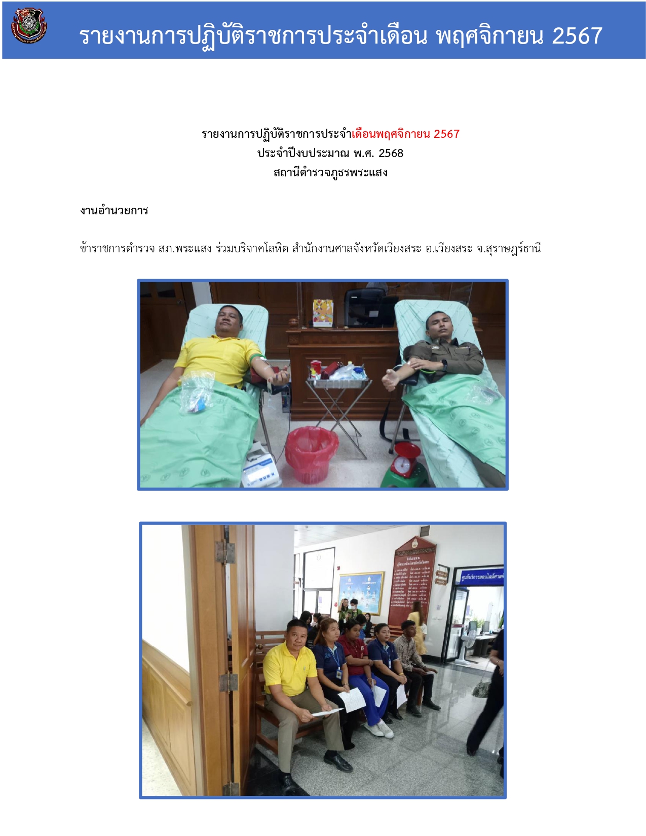 รายงานการปฏิบัติราชการประจําเดือนพฤศจิกายน 2567 ประจําปีงบประมาณ พ.ศ. 2568 สถานีตํารวจภูธรพระแสง ชุด