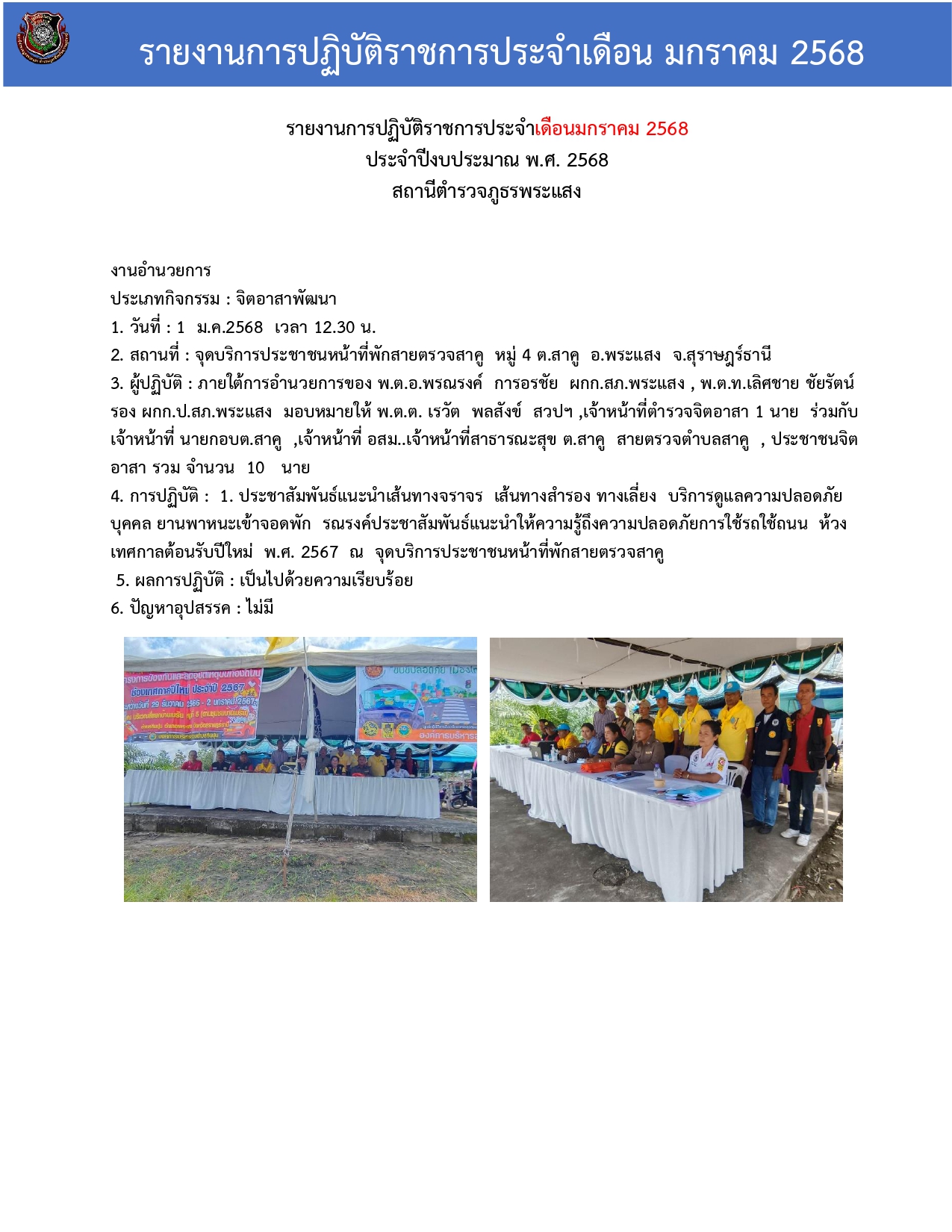รายงานการปฏิบัติราชการประจําเดือนมกราคม 2568 ประจําปีงบประมาณ พ.ศ. 2568 สถานีตํารวจภูธรพระแสง วันที่