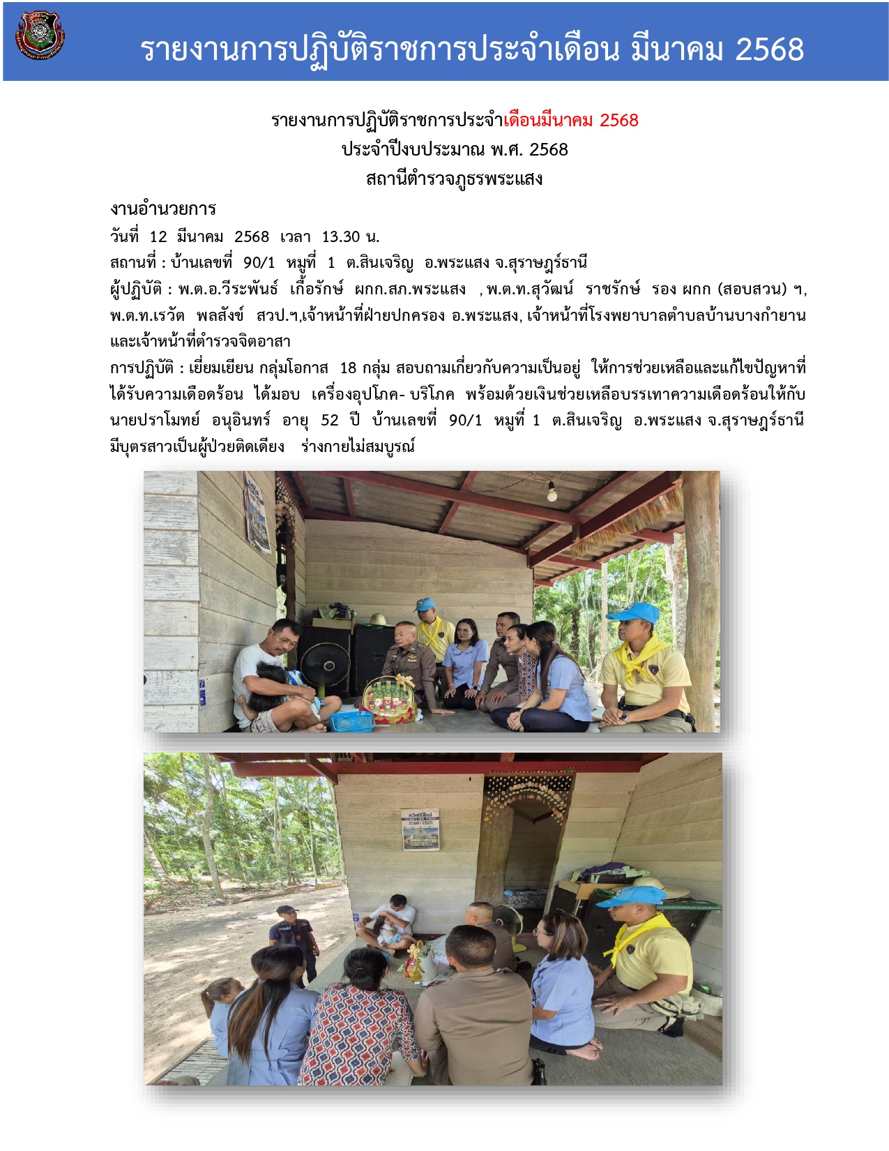 รายงานการปฏิบัติราชการประจําเดือนมีนาคม 2568 ประจําปีงบประมาณ พ.ศ. 2568 สถานีตํารวจภูธรพระแสง ชุดสาย